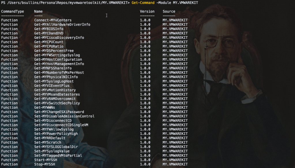 Because the Manifest file has the RootModule = 'MY.VMWAREKIT.psm1' in it, this will import the Module with the metadata included in the manifest file. You can see some of the relevant manifest information if you type the Get-Command -Module MY.VMWAREKIT as above.